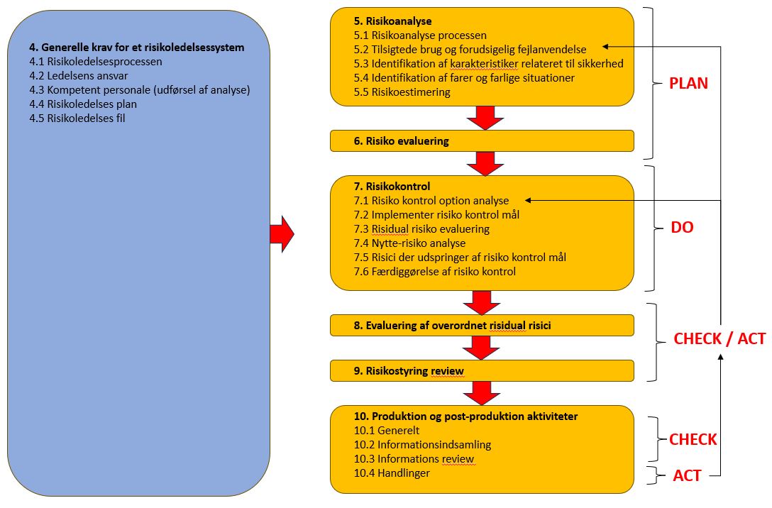 Punkt 4, angiver generelle krav til risikoledelsessystemet. Punkt 5 beskriver selve risikoanalysen, og punkt 6 beskriver risiko evalueringen, og punkt 7 risikokontrol.